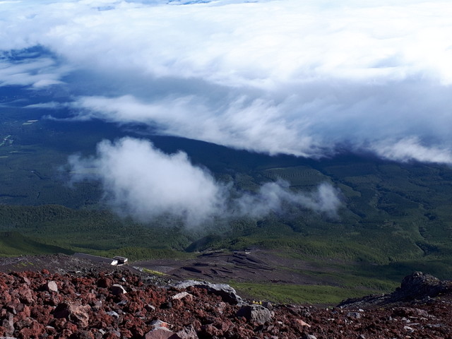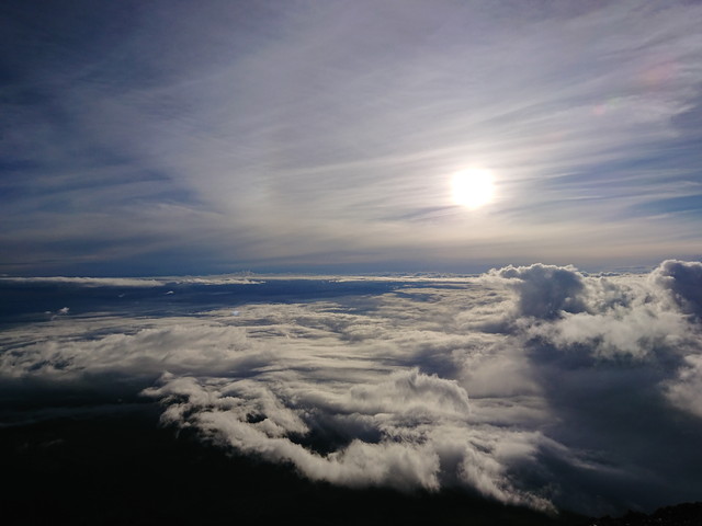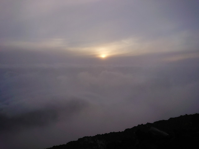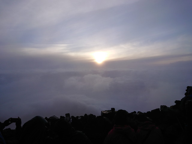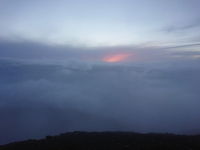 富士登山の2日目です。2:00に山小屋の方に起こしてもらって、準備をして朝ごはんを食べました。山小屋を出発したのが2:40です。外は真っ暗でしたが、雲もなく、地上の明かりや星がよく見えていました。人が多くて登山道は渋滞しており、ゆっくり登ります。八号五勺には2:57、九合目には4:05、山頂には5:00に到着しました。途中で雨が降り始めたので、合羽を着ました。山頂に着いた時には、既に日の出時刻を過ぎていましたが、雲があり、御来光はまだでした。曇っていて見れるかどうか不安でしたが、しばらく待つと御来光を見ることができました。山頂でお土産を買って下山です。