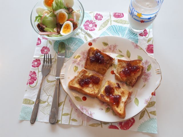 調理実習 中学校 2018.08.29(水) 《とり》の夏休みはまだまだ続きます。今回はパンを使った食事で作り慣れているものという課題なのでフレンチトースト、サラダ、バナナジュースです。テーマは『包丁を使わなくてもできる朝ごはん』だそうです。パンは前日にカットをしているので朝は焼くだけ。厚切りベーコンもカットをして冷凍してあるので焼くだけ。ゆで卵は専用のカッターでカット。普段はお米なのでたまにはパンもいいですね。