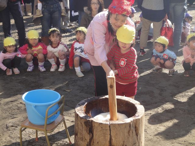 幼稚園でおもちつきがありました。まずは《いぬ》のクラスからです。《いぬ》も一生懸命ついていました。おもちつきが終わってから担任の先生が入籍されたのでみんなでプレゼントを渡しました。子供たちはみんなそれぞれ折り紙でプレゼントを折って渡し、お母さんたちからディズニーランドのペアパスポートを渡しました。とても喜んでくれました。教室でおもちを食べてから次は《とり》のクラスです。年長さんは杵を一人で持っている子もいました。《たつ》も《へび》もおもちをつかせてもらいました。ついたおもちを持って帰って、家でゆっくりいただきました。つきたてのおもちはとてもおいしかったです。