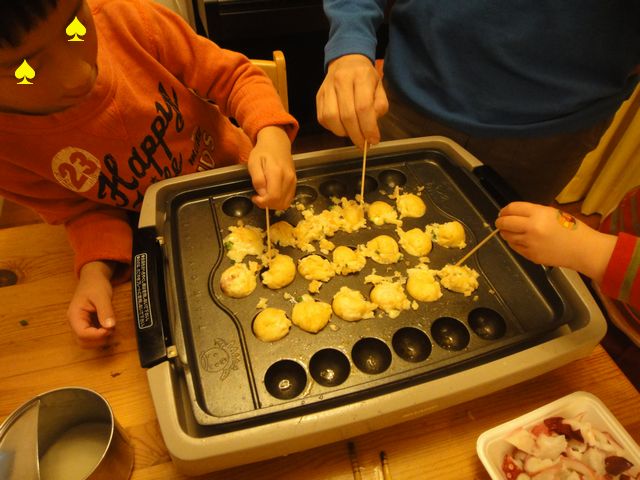 夜はたこ焼きパーティーをしました。《とり》はひっくり返すのが上手になってきました。お口直しにはパステルのプリンです。とてもおいしかったです。