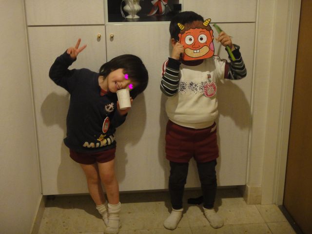 節分 子育て 2011.02.03(木) 節分なので夜には恵方巻きを食べて豆まきをしました。《とり》は微熱があったのでスイミングを休みましたが、結構元気で豆まきも楽しんでいました。 お昼には配管の清掃がありました。《いぬ》は清掃のお兄さんたちの周りをチョロチョロして帰りにはまた来てねーと声をかけていました。今日のおやつは《へび》の作ったマドレーヌでした。
