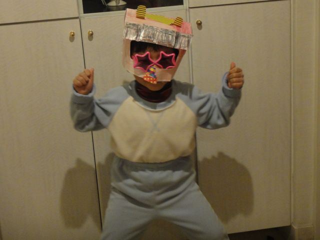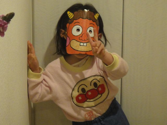 夜ごはんを食べてお風呂に入ってから、《とり》と《いぬ》がもう一度豆まきをしたいと言うので、豆まきをしました。《とり》は自分で作った鬼のお面を、《いぬ》はもらったお面をつけて、鬼役を楽しんでいました。