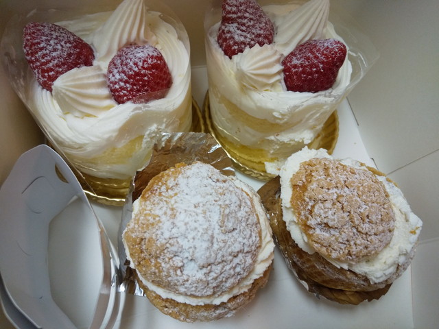 夜のデザートのケーキです。シュークリームとショートケーキを誰が食べるか激論の結果、仲良く半分ずつにすることになりました。