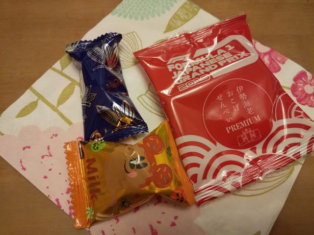 会社で鈴鹿、シンガポールなどのお土産をいただきました。台風で帰国できず延泊したそうです。