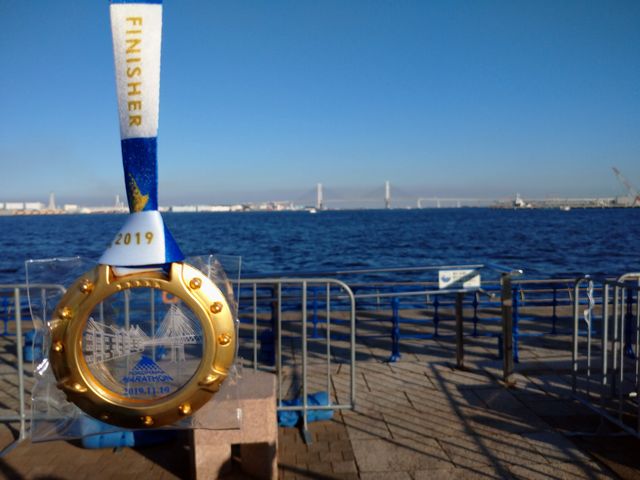 横浜マラソン その他 2019.11.10(日) 《たつ》が横浜マラソンでフルマラソンに初挑戦しました。雲ひとつない天気で気温も暑くもなく寒くもなかったです。15kmぐらいまでは調子よく走って富士山が見えた時は写真を撮る余裕もありました。21kmぐらいで首都高に入ってからは全く余裕がなかったです。気力で走って、6時間12分かかりましたが、何とか完走しました。完走記念のメダルもゲットして満足です。