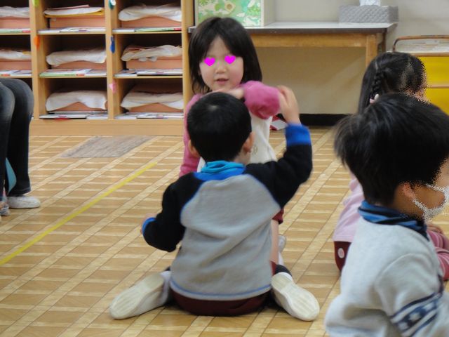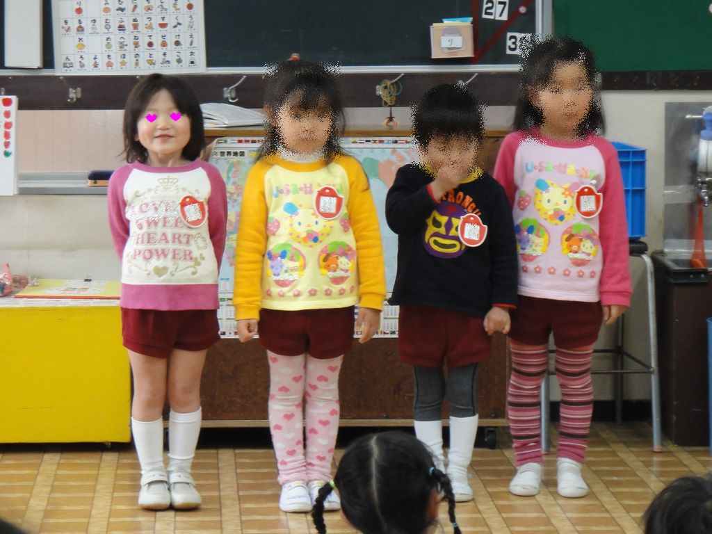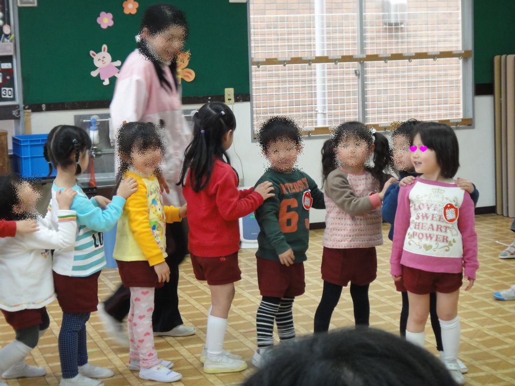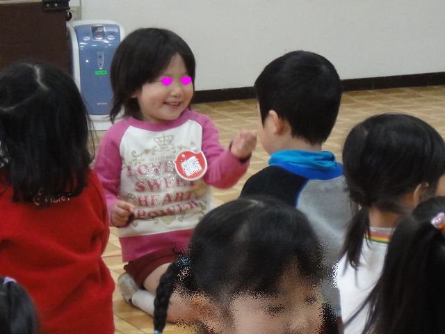 参観日 幼稚園 2011.02.19(土) 《いぬ》の参観日でした。最初はお友達とじゃんけんゲームをしていました。《いぬ》はとても楽しそうでした。この日は《いぬ》がお当番だったので、出席を取っていました。誇らしげに前に立って、ずっとニコニコしていました。最後はじゃんけん電車をしました。この日初めてルールを聞いてしたので、まだルールのわからない子もいましたが、クラスみんなで楽しそうに遊んでいました。 ちなみに《とり》は朝から熱を出したので、《へび》と《とり》はお家でお留守番です。