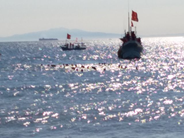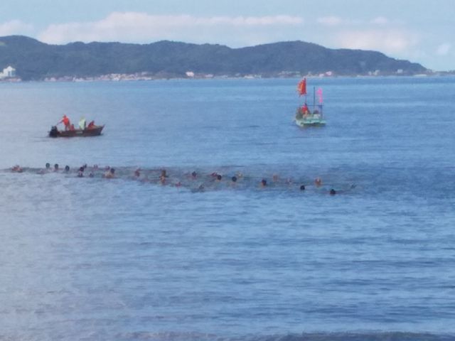 《とり》の合宿が見学できる日なので行ってきました。《いぬ》は大会があるので《へび》と二人で行きました。今回は早めに家を出たので遠泳の準備から見学ができました。見送ってから宿舎で休憩をして到着地点に向かいました。お昼休憩をして復路を泳ぎはじめてから保護者は昼食です。