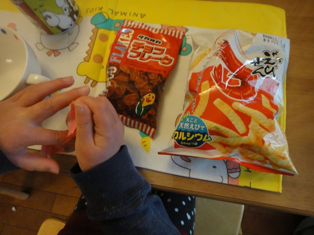 お別れ会 幼稚園 2011.03.02(水) 今日は園児同士のお別れ会でした。《とり》は《いぬ》のクラスに行き、メロディオンを演奏したそうです。一緒にお弁当やおやつも食べて、ネックレスをもらってきました。残ったおやつは家でうれしそうに食べていました。 《へび》のお父さんがアンリ・シャルパンティエのお菓子を沢山送ってくれたので、おやつに一緒にいただきました。
