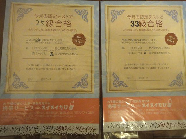 合格 習い事 2011.03.03(木) スイミングの進級テストがありました。《とり》は25級に、《いぬ》は33級に、それぞれ合格しました。来週からは、《とり》がノーブレスクロール10m、《いぬ》が板つき背浮き5秒の練習をすることになります。