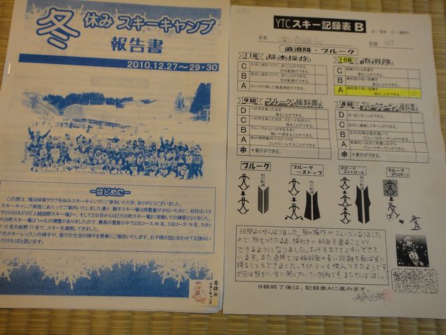 スキーキャンプ報告 習い事 2011.03.07(月) 《とり》が年末に行ったスキーキャンプの報告書をもらって帰ってきました。直滑降で緩斜面の長い距離を転ばずに滑ることができたようです。報告書を持ってきて、何度も自慢げに教えてくれました。 スキーキャンプの写真もありますので載せておきます。スキャナで取り込んだものなので、ちょっと画質は悪いかもしれません。 ストックは使っていませんが、ちゃんとエッジを立てて滑っているようです。新幹線の中や、旅館でも楽しそうにしています。