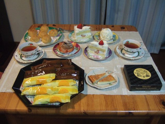 シャトレーゼにシュークリームを買いに行ったら、《とり》と《いぬ》がケーキのショーケースから離れず、ケーキを買うはめになりました。さらに写真の手前の真ん中にある手作りのチーズケーキを近所のママから差し入れでいただきました。というわけで、今夜はケーキ三昧です。