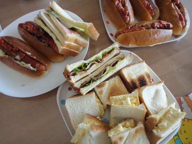 ホットドッグ 子育て 2011.03.26(土) 《とり》と《いぬ》がお昼ご飯のホットドッグとサンドウィッチを作ってくれました。マヨネーズやケチャップを塗るのはまだ難しいようで、何度か手伝って欲しいと呼ばれました。出来上がった時に《いぬ》の口の周りに、つまみ食いした跡がありました。油断も隙もありません。でも、どれもおいしかったです。