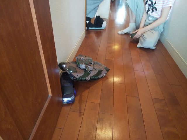 《とり》と《いぬ》がラジコンで遊んでいました。夜は《へび》がお友達とオンライン飲み会をしていました。