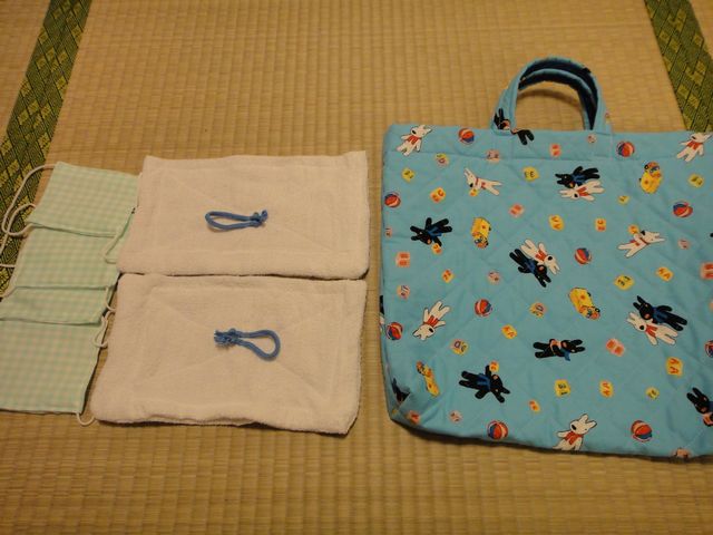 入学に向けて《へび》がぞうきんやマスクなどを作りました。計画停電で外出できない時期が続いたので布を買いにいく時間がなかなかとれず、ようやく完成しました。