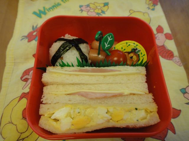 お弁当 幼稚園 2011.04.21(木) 幼稚園のお弁当がやっと始まりました。クラスに慣れるまでは子供の好きなものを入れるように言われているので、《いぬ》にメニューを決めてもらいました。サンドウィッチと梅干しのおにぎりがいいと言うのでその通りに作りました。