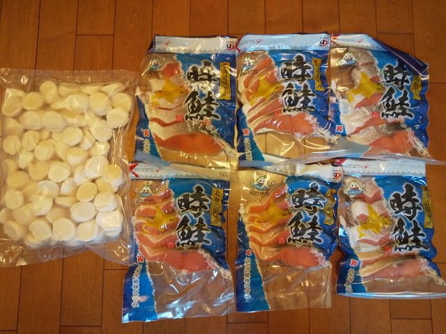 ふるさと納税のお礼のホタテと鮭が届きました。根室市です。沢山ありますがすぐになくなりそうです。