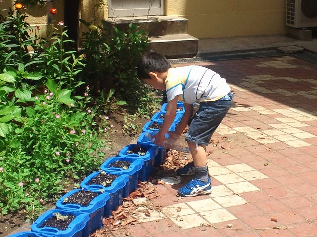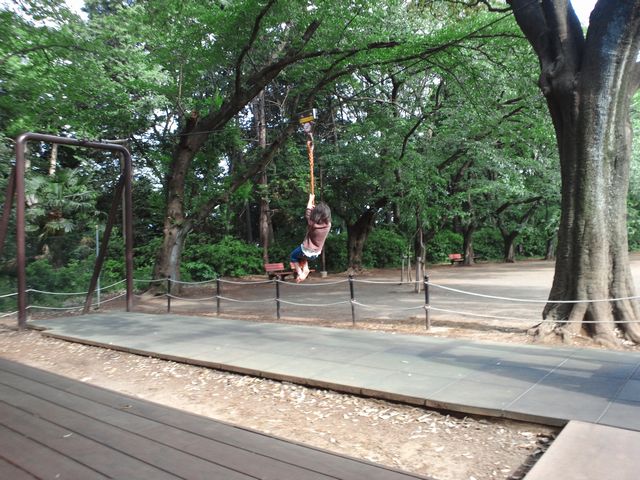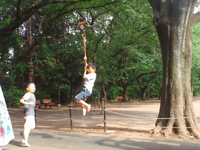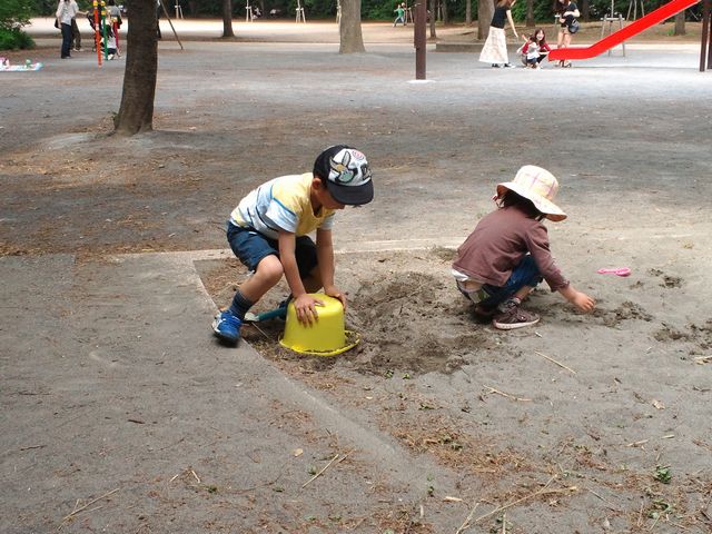 公園 子育て 2011.05.21(土) 午後から《とり》と《いぬ》を連れて公園に行ってきました。まずは砂場でずっと穴を掘って遊んでいました。それからログハウスに行ってターザンロープで遊んだり、鬼ごっこで走り回ったりしていました。《たつ》は座って見ていただけですが、見ているだけで疲れました。 午前中はコストコに買い物に行った後に小学校へ朝顔の水やりに行ってきました。《とり》は自分の分だけでなく、クラス全員の分の水やりをしていました。