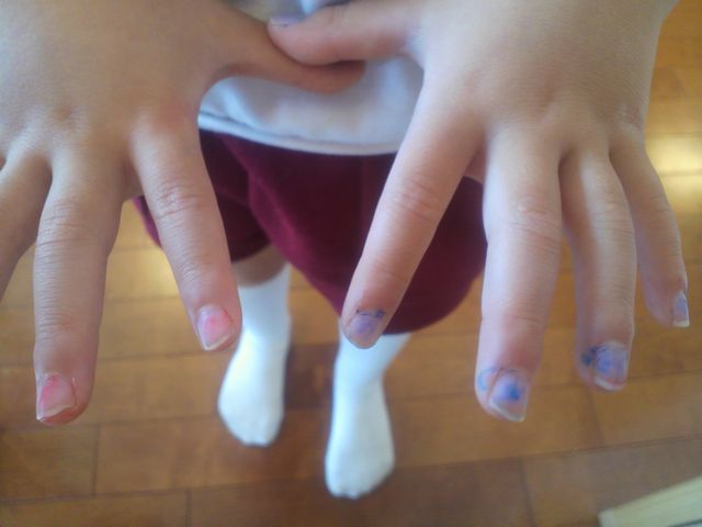 マニキュア? 子育て 2011.06.01(水) 朝ごはんを食べている時、《とり》が《いぬ》の爪がおかしいのに気付きました。爪をマジックで塗っていました。《へび》はマニキュアは塗らないのに、どこで覚えてきたのやら。。。