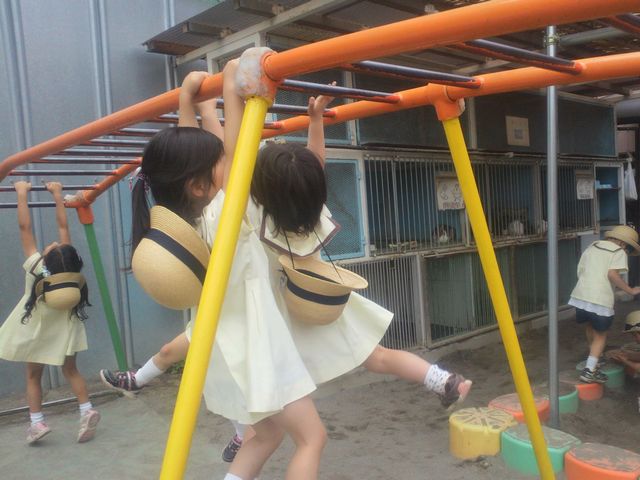 フラワーアレンジメント 習い事 2011.06.16(木) 《へび》がフラワーアレンジメントの体験に行ってきました。上から見たときに楕円になるアレンジです。ボリュームがあって、とてもきれいです。 午後、《いぬ》を園庭まで迎えに行くと、制服のままウンテイで遊んでいました。
