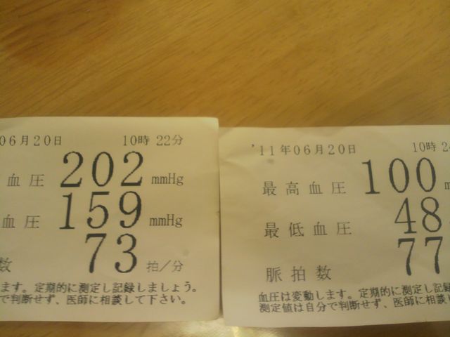スイミング その他 2011.06.20(月) 《へび》がスイミングに行ってきました。泳ぐ前に血圧を測るのですが、1回目は高血圧過ぎてすぐに病院に行った方がいいような数値でした。測り直すと今度はありえないような低血圧でした。今日はなかなかうまく測れませんでした。