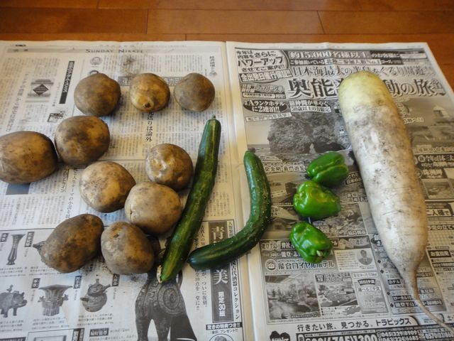 おすそわけ 食べ物 2011.06.26(日) 《とり》のお友達が掘りたてのお野菜を沢山届けてくれました。おじいちゃんの畑で採ってきたそうです。さっそくポテトサラダにしていただきました。とてもおいしかったです。 夜ごはんはみんなで餃子を作りました。《とり》も《いぬ》も自分で作ったのを食べると言いながら作っていました。《たつ》は昼間は試験でいなかったので、お土産にビアード・パパを買って帰りました。
