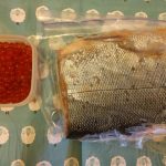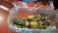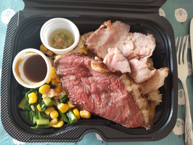 《へび》のお昼ご飯です。シュラスコ屋さんのお弁当でお肉が何種類か載っています。