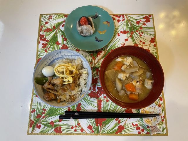 調理実習 高校 2021.12.18(土) 《とり》の学校の調理実習をしました。土鍋で釜飯、豚汁、苺大福です。 待ち時間に修学旅行の写真を追加でもらいました。カレーにカニが入っていたり、みそ汁に帆立が入っていたりで美味しそうです。
