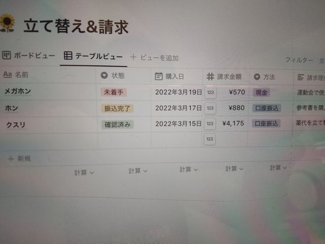 《へび》がタブレットにNotionを入れていてあまり使っていなかったのですが、お金の請求だけ《とり》と共有するようにしました。今まで買い物リストやプールの立替金はグーグルメモで共有していましたがNotionの方が見やすいです。学校での係活動もタスク管理をNotionでして皆で共有しているそうです。