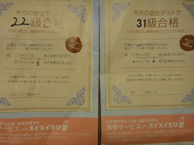 進級テスト 習い事 2011.07.21(木) スイミングの進級テストがありました。《いぬ》はけのび3mに合格して、次からはヘルパー付で板キック5mです。《とり》は板付片手クロール12.5mに合格して、次はクロール12.5mの練習です。