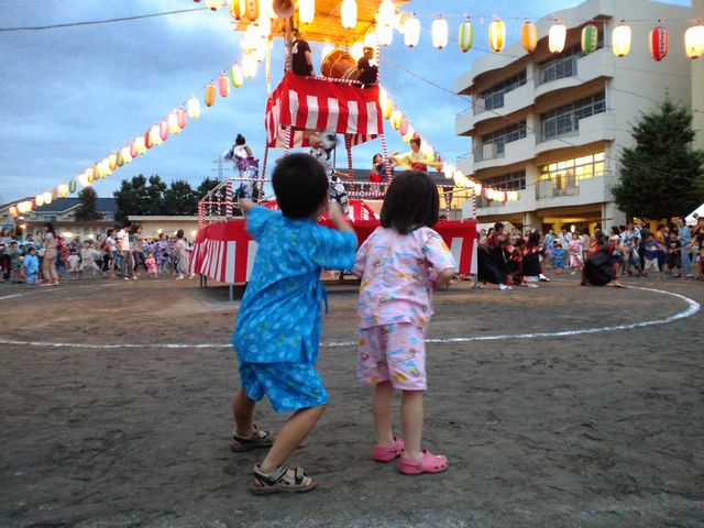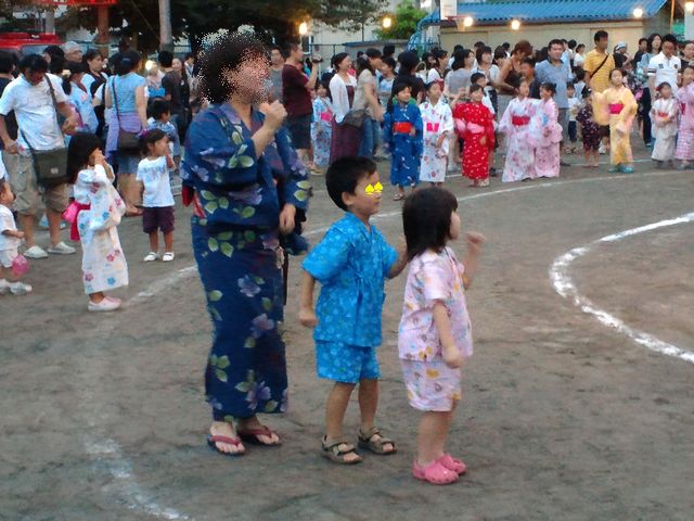 盆踊り 子育て 2011.07.23(土) 近所の盆踊りに行ってきました。《とり》も《いぬ》も何回か練習に行ったので、踊りはばっちりです。特に《とり》は楽しそうに1時間くらい踊り続けていました。踊りが終わると花火がありました。数は少ないですが、真上に上がるのでとても迫力がありました。