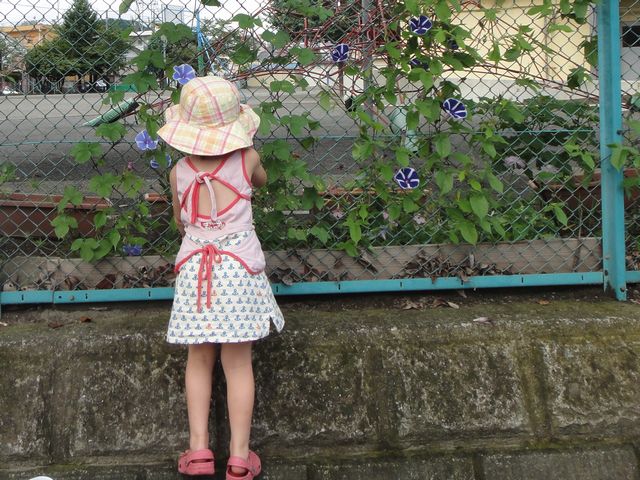 午前中は《とり》だけキッズクラブの水遊びに出かけて行きました。《いぬ》も見学したいと言うので、小学校まで見に行きましたが、雨が降ったりやんだりで水遊びはやっていませんでした。《いぬ》は自分が植えた朝顔が満開になっていたので喜んでいました。《とり》は水遊びはできなかったもののお友達と遊べたのでうれしそうに帰ってきました。