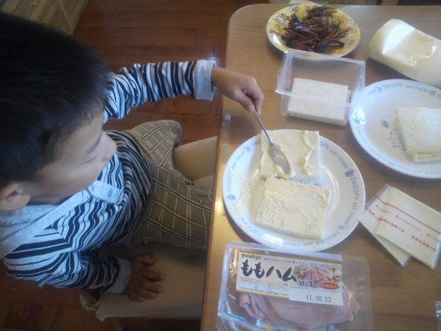 《いぬ》の運動会がありました。お弁当に入れるハムとチーズのサンドイッチは《とり》が作ってくれました。クリームチーズとイチゴジャムのサンドイッチは前日に作って冷凍しておいたので、食べる頃にはちょうどよかったです。《いぬ》の希望で作ったら茶色いお弁当になってしまいました。