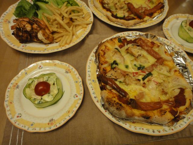 お誕生日会 食べ物 2011.10.16(日) 午前中は、《とり》を連れてスポーツクラブで泳いできました。午後からは《いぬ》のお誕生日会の準備です。《いぬ》のリクエストでピザと海老フライにしました。セルクルサラダの中身はマカロニサラダです。ケーキは《いぬ》の希望で今年もキティちゃんのケーキです。写真は撮り忘れました。。。