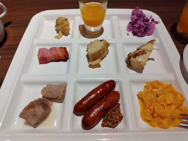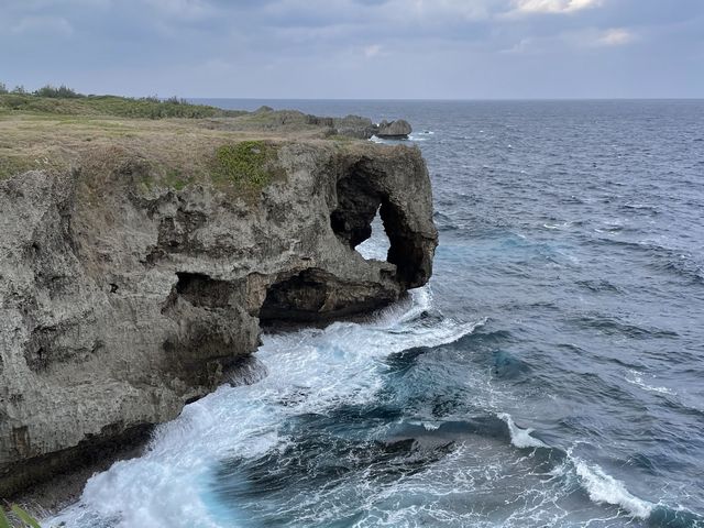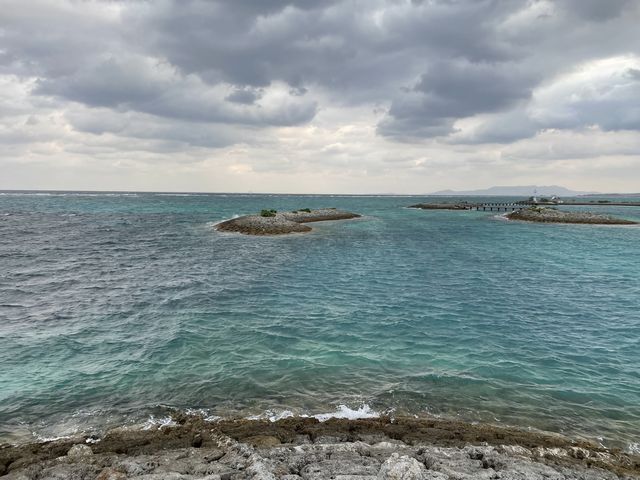 朝ご飯は洋食のビュッフェです。朝の散歩では潮が引いていて、きれいでした。まずは万座毛を観光です。景色はきれいでしたが、風が強くて歩くのが大変でした。
