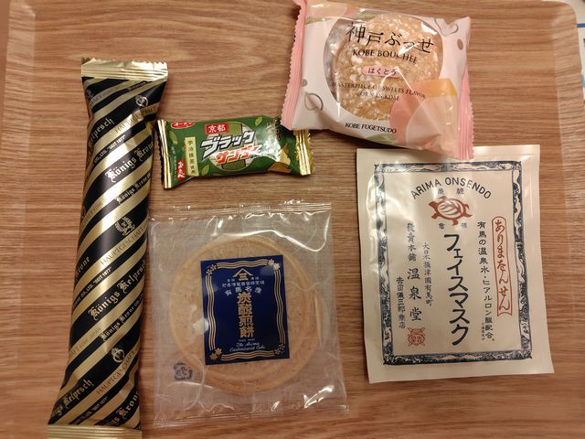 友人から有馬温泉などのお土産を頂きました。買物でお店員さんがクレジットカードの決済金額を間違えたとの事でサンプルも沢山頂きました。