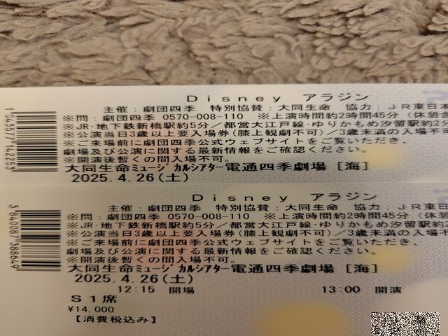 チケットが当選したので《へび》《いぬ》でアラジンを観に行ってきました。席が前方真ん中でかなり観やすかったです!《たつ》も同じ駅で部下の結婚式に出席していました。