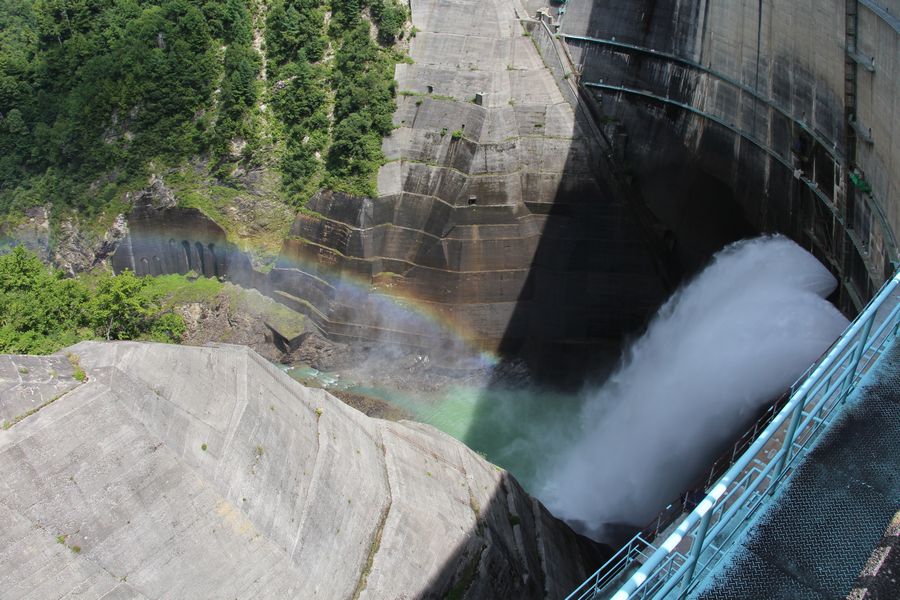 立山黒部アルペンルートで扇沢から室堂まで行ってきました。扇沢の駐車場に車を停めて電気バスで黒部ダムへ向かいます。220段の階段を登って展望台から黒部ダムを見ました。外階段を降りるとくろにょんがいました。ちょうど晴れていて放流した水に虹がかかっていました。