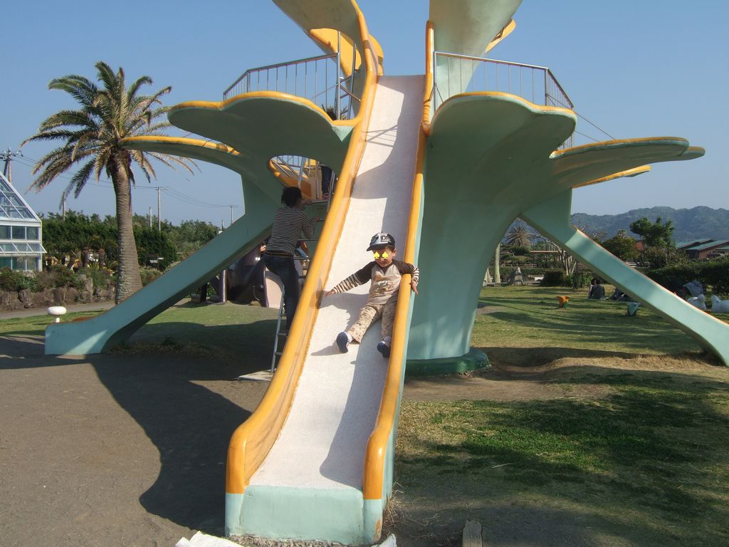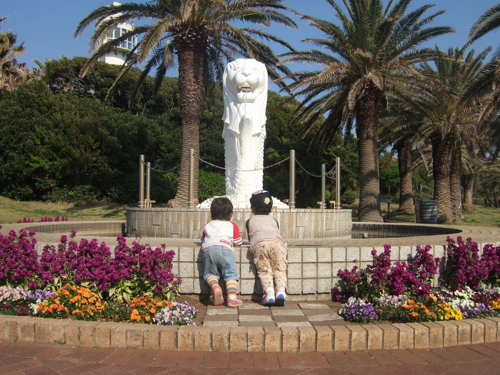 最後に「南房パラダイス」に遊びに行きました。ここはシンガポール植物園と姉妹提携しているようで、入り口にマーライオンがあります。《とり》も《いぬ》も不思議そうに見入ってました。《とり》も《いぬ》も植物園には、ほとんど興味を示さなかったので、さらっと見て遊具のある所で遊ばせました。
