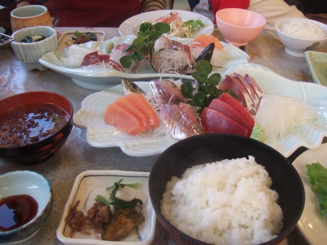 夜ごはんは「磯料理 みずるめ」で刺身定食を食べました。地魚のお刺身はおいしいですね。《とり》と《いぬ》は金目鯛の煮つけとごはんです。どれもおいしかったです。できればお酒を飲みながら食べたいですね。