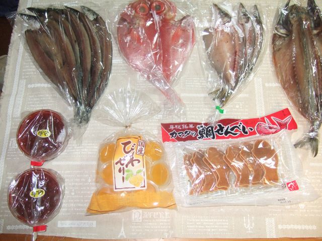 今回の旅行で買ったおみやげはこちらです。干物は左側から、さんま・金目鯛・かます・サバで、手作りイチゴジャムも買いました。ちなみにすべて自宅用です。お花畑で摘んだお花は写真を撮ってから花瓶に飾りました。