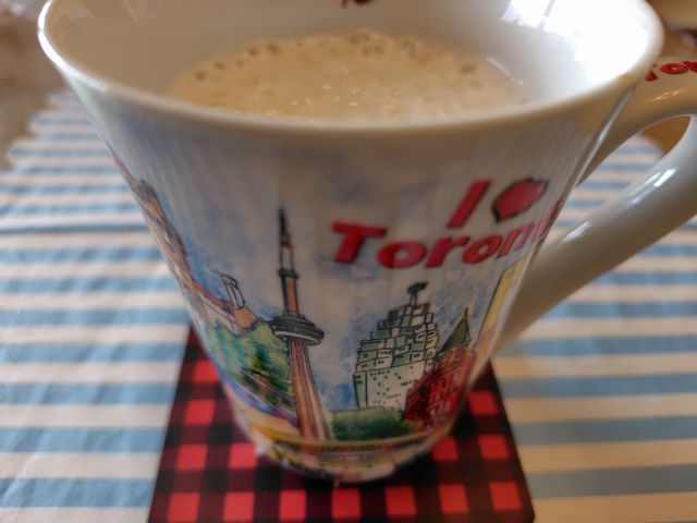 コーヒー 食べ物 2025.08.27(水)2025.09.03(水) 《とり》がカナダでティムホートンズのコーヒーを買ってきてくれたので早速飲みました。コースターとマグカップはチャイナタウンで買ったそうです!