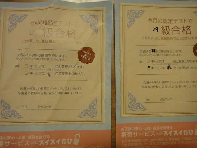 スイミングの月に一度の進級試験がありました。《とり》も《いぬ》も合格です。次は《とり》は背泳ぎキック12.5m、《いぬ》はヘルパーありで背面キック5mの練習になります。