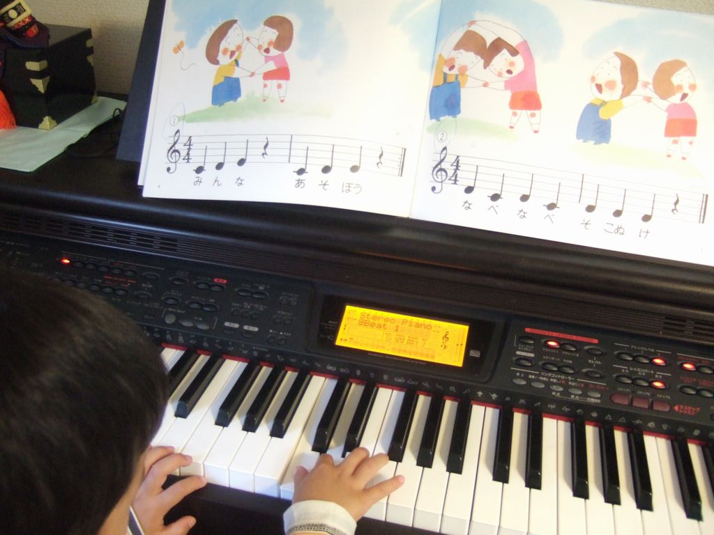 ピアノ教室 習い事 2009.05.01(金) 《とり》が今日からピアノ教室に通ってます。本当は毎週火曜日なのですが、来週はゴールデンウィークということもあり、今日だけ金曜日です。 まずは右手だけでドレミの読み書きの練習です。ト音記号も習いました。先生がドの音符を指さして、「これは何?」と聞くと、「だんご!」と元気よく答えてました。完全に間違ってますね。。。 家に帰ってからは今日の復習です。《へび》と一緒に今日習ったことを一生懸命復習してました。お絵かきボードを使ってト音記号を書く練習もしてます。