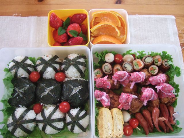 「子どもの広場」で遊んでいるうちに、《とり》がお腹が空いたと言い出したので、お昼ごはんにしました。《へび》がいつも通り朝6時半に起きて作ってくれたお弁当を皆でおいしくいただきました。写真の通りイチゴとデコポンのデザート付で4人分のでっかいお弁当です。
