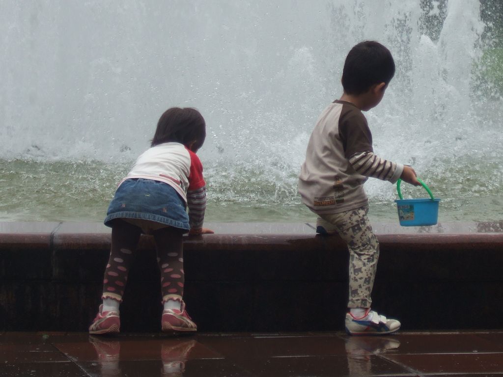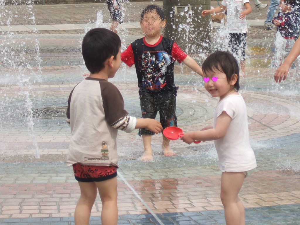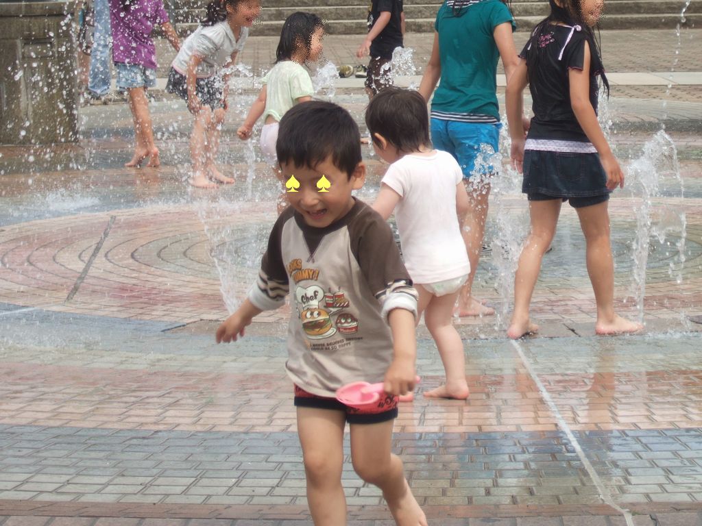 噴水の所で、散々水遊びをしていましたが、今度は「水の広場」で本格的(?)に水遊びです。ちょうど暑い時間帯だったこともあり混雑していましたが、噴き出てくる水を抑えたり、飛び越えたりして遊んでいました。《たつ》と《へび》は近くのベンチに座って、あす以降の予定を相談しながら眺めてました。