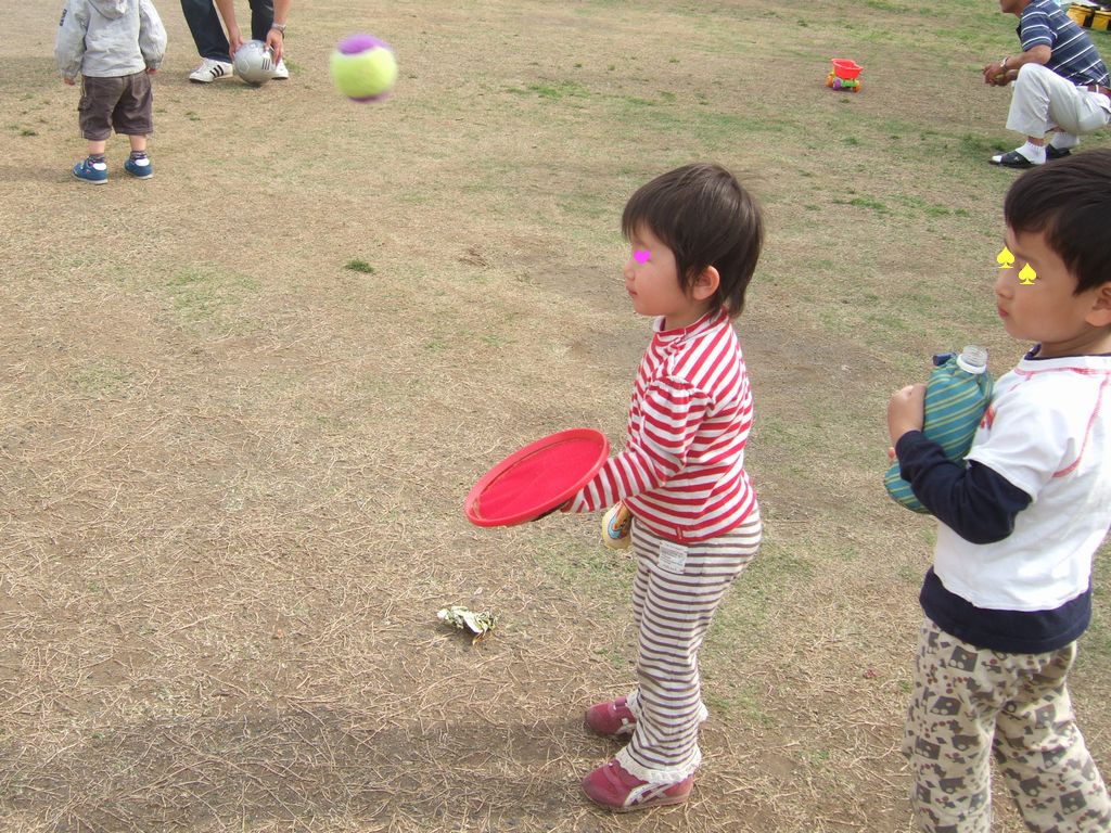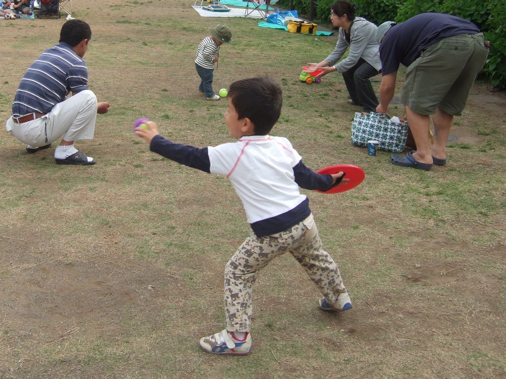 「水の広場」で散々遊んだら、今度はボール遊びをすると言い出したので、芝生公園でボール遊びをしました。家から持っていった道具でキャッチボールです。この遊具は手に付けるディスクとボールがマジックテープでくっつくようになっているので、《とり》や《いぬ》でも何とかキャッチボールができます。初めての体験でしたが、楽しんでくれたようです。