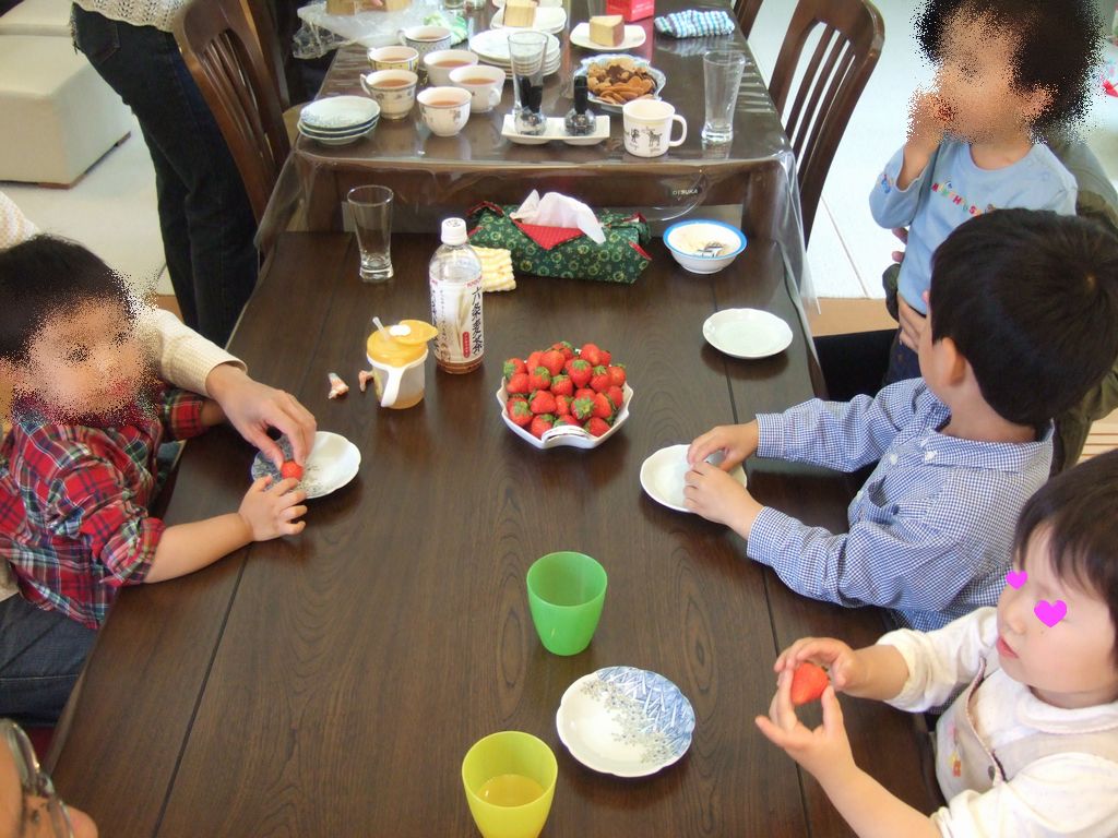 おやつタイムの様子です。イチゴは親もいただきましたが、半分以上は子供たちが食べてしまいました。クッキーとバームクーヘンはマッターホーンというお店のものです。豪華な昼食を食べた後ですが、デザートは別腹ということで、おいしくいただきました。