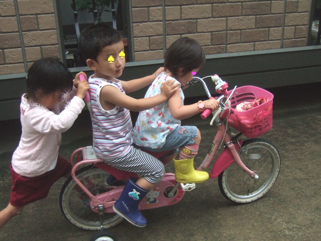 自転車 お友達 2009.07.02(木) スイミングから帰ってくると小雨の中、1組だけ遊んでいたので一緒に遊びました。《いぬ》が先頭に乗って2人を乗せて自転車をこいでいます。みんなびっくりしていました!!