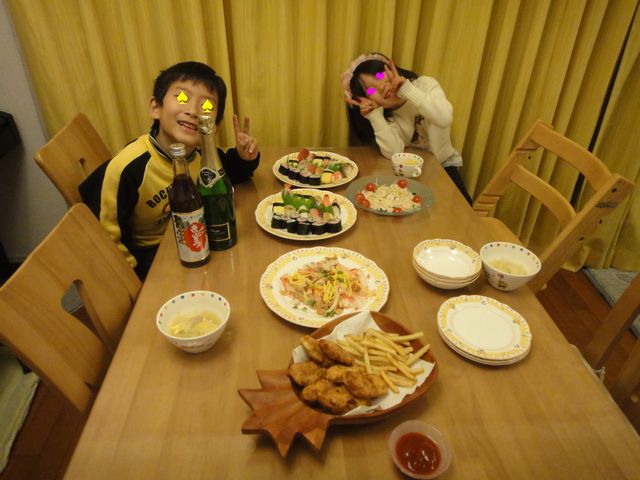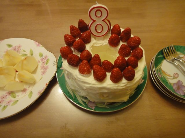 お誕生日 子育て 2013.01.26(土) 夕方から《とり》のお誕生日会をしました。《へび》の体調がよくないので、あまり料理が作れず、お弁当用に作っておいたナゲットを揚げてサラダとスープを作って簡単に済ませました。ケーキは前日にシフォンケーキを作っておいたので、《いぬ》がクリームとイチゴをのせました。