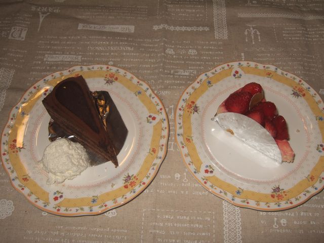 夜のデザートは自由が丘で買ったチョコのケーキと苺のレアチーズケーキです。《たつ》と《へび》でおおいしくいただきました。
